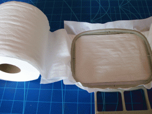 4. Center the middle doubled square of T.P. on one of the cut-away stabilizer pieces and put the water-soluble stabilizer on top. Gently hoop together with the sandwich centered in the hoop.