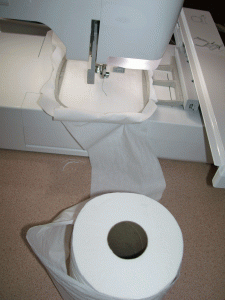 5. Hook the hoop to your machine. Place the roll of T.P. to the side or back of the machine. Create enough slack in the T.P. such that when the hoop moves the toilet paper will not tear.