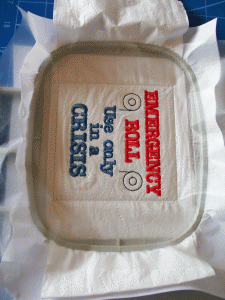 Do you need a gift for a wedding shower this weekend, or for your sister’s 50th wedding anniversary, or maybe for a friend’s birthday? Some of you may think that embroidering on toilet paper is a silly idea – and it is, but sometimes it is good to do something specifically because it is a silly idea.